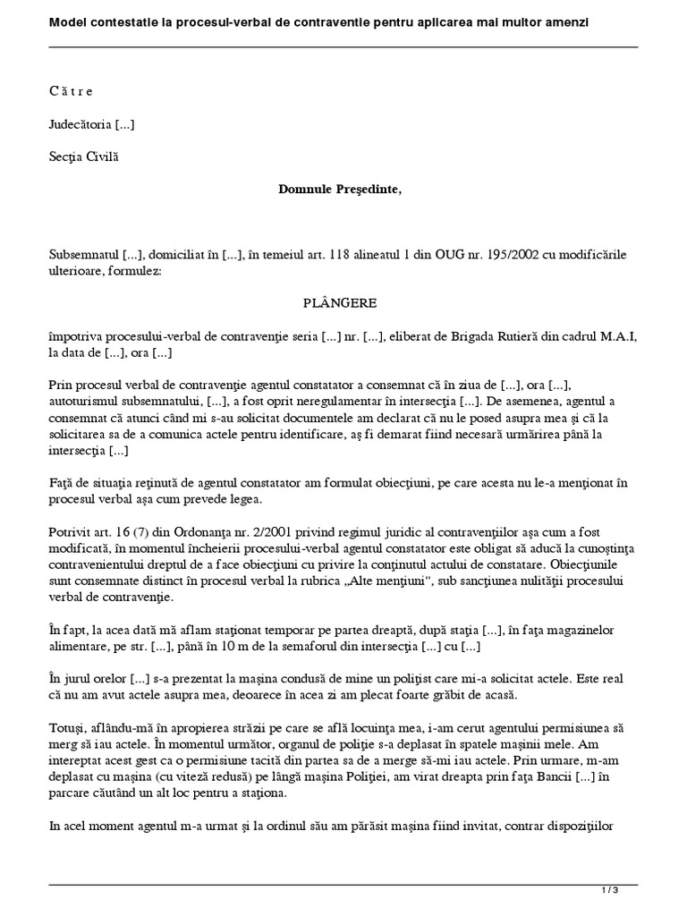 Model De Contestatie Proces Verbal Pentru Amenzi
