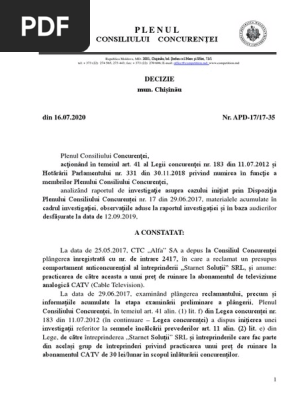 Decizia Plenului Consiliului Concurenţei Nr Apd 17 17 35 Din 16 07 2020